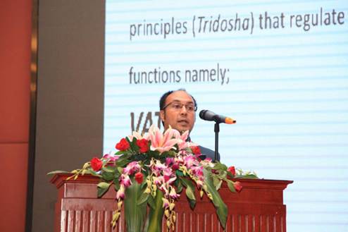 论坛的另一个主题是“一带一路”与传统医药之间的合作。来自尼泊尔的阿信·百地亚博士以“一带一路”与传统医药的国际合作为题做了专题演讲。他首先向与会者介绍了阿育吠陀如何给大家带来的身心健康以及如何有效地种植药用植物即草药,如何利用现代技术从天然的植物中提取药物以及如何开展传统医药的国际合作。