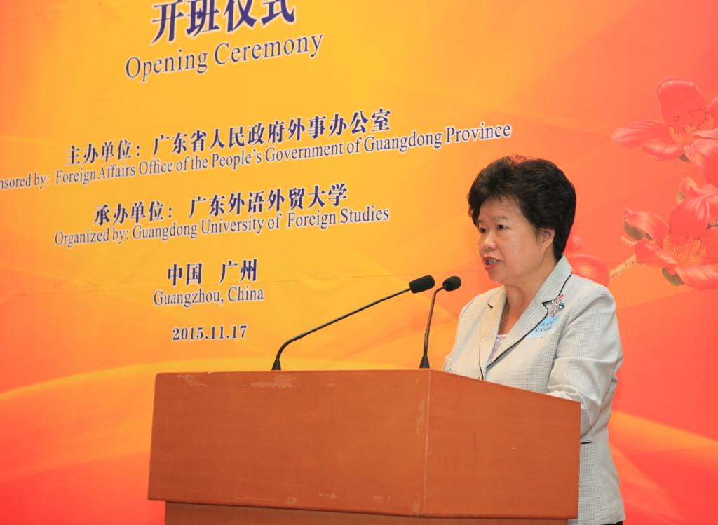 省外办副主任苏才芳首先代表主办方用英语致词。她对全体学员的到来表示热烈欢迎,她特别提到广东与太平洋岛国长期以来有着紧密的联系和交流。从2007年起广东共计派出了50多个代表团组前往太平洋岛国开展文化交流、医疗服务等活动,广州与斐济首都苏瓦和密克罗尼西亚丘克州结成友好城市。她勉励全体学员结合自己的亲身经历,为全面深化中国与太平洋岛国的交流合作做出更大的贡献。