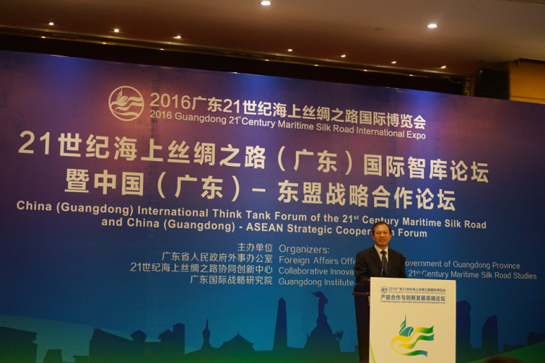 10月28-30日,2016广东海上丝绸之路国际博览会高端论坛分论坛——21世纪海上丝绸之路(广东)国际智库论坛暨中国(广东)—东盟战略合作论坛、中国—东盟产能合作研讨会在穗举办。系列会议聚焦国际产能合作,深入研讨“一带一路”框架下中国与海上丝绸之路沿线经济体,尤其是东盟国家在基础设施建设、国际产能合作、经济贸易往来等方面存在的机遇、挑战与实施路径。产能合作系列会议由广东国际战略研究院、21世纪海上丝绸之路协同创新中心主办,外交部、商务部、广东省政府及省委政研室、省府发展研究中心、省商务厅、省外办、省贸促会、广州市贸促委等单位对会议予以重要支持。系列会议由广东外语外贸大学党委书记、广东国际战略研究院常务副院长、21世纪海上丝绸之路协同创新中心主任隋广军教授主持。