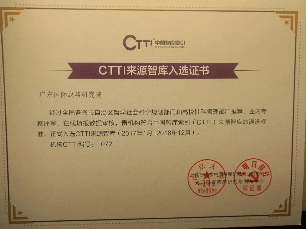 论坛特别发布了CTTI来源智库(2017-2018)入选名单。经过全国智库机构摸底调查、委托有关机构推荐来源智库、业内专家评审等环节,最终确定首批入选CTTI的来源智库有489家,包含党政部门智库68家、社科院智库46家、党校行政学院智库44家、高校智库255家、社会智库36家、媒体智库11家。广东国际战略研究院作为高校智库成功入选,包括广东国际战略研究院在内,广东省共有18家智库进入首批名单。