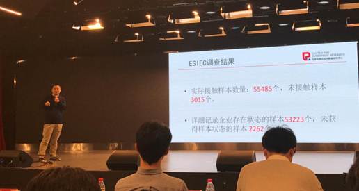 项目组执行负责人李德洗博士对本次调研的具体情况与成果进行了汇报。本次ESIEC调研实际接触样本数量达55485个,未接触样本3015个。在实际接触样本中,详细记录企业存在状态的样本数量为53223个,未获得样本状态的样本数为2262。