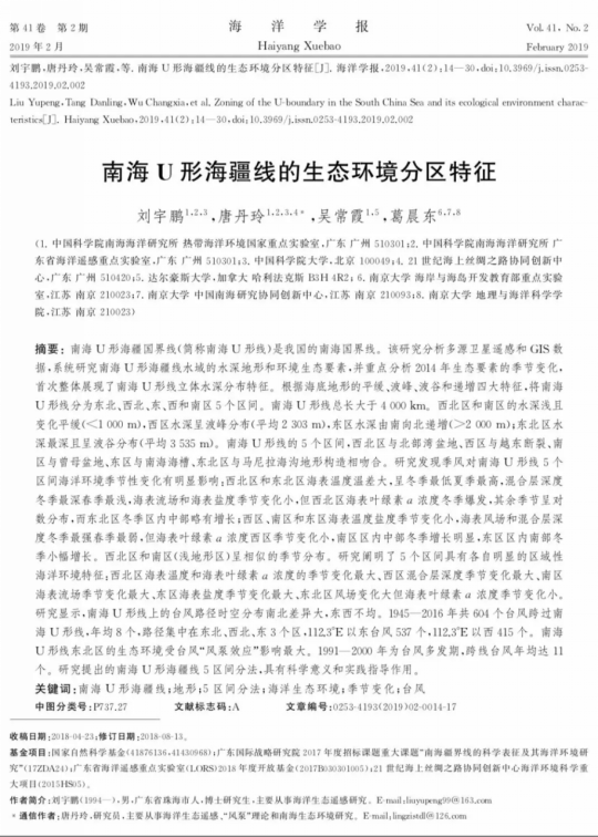 刘宇鹏, 唐丹玲*, 吴常霞, 葛晨东,2019.南海U形海疆线的生态环境分区特征[J]. 海洋报, 2019, 41(2): 14—30,doi: 10.3969/j.issn.0253-4193.2019.02.002