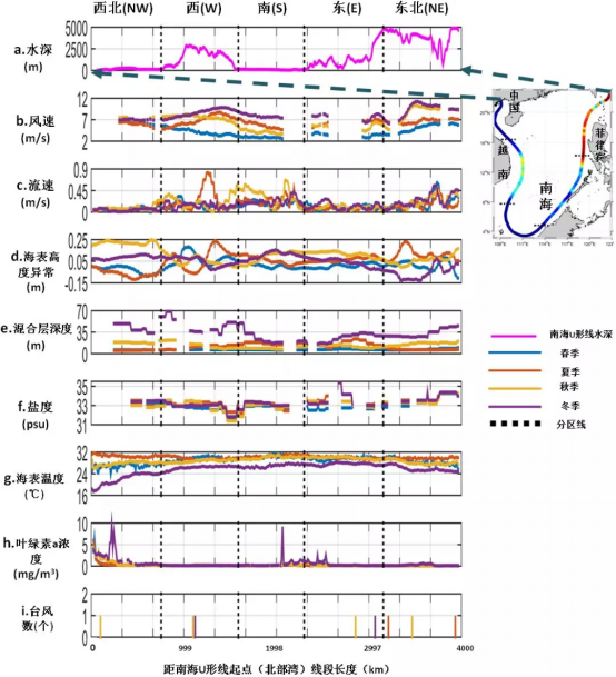 图2. 中国南海U形海疆线(5区:西北、西、南、东和东北区)a.水深、2014年四季b.风速c.海表流场d.海表高度异常e.海洋混合层深度f.海表盐度g.海表温度h.海表叶绿素a浓度i.台风数(蓝、橙、黄、紫分别为春季、夏季、秋季、冬季,黑色虚线表示南海U形线5区分区位置,折线图空缺位置表示数据缺失)