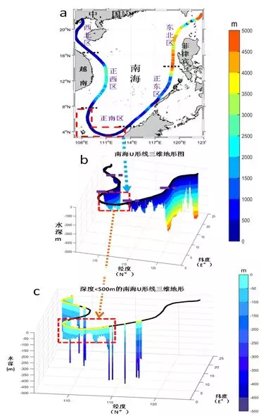 首次整体展现了南海U形海疆线水深分布特征。研究根据海底地形的平缓、波峰、波谷、递增四大特征,提出将南海U形线分为东北、西北、东、西和南区五个区间的“五区间分法”,南海U形线地形为西北和南区两区的地形浅、变化平缓(<1000m),西区呈波峰分布(平均2303m),东区由南向北递增,水深超2000m;东北区呈波谷分布,水深最深(平均3535m)。