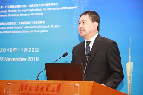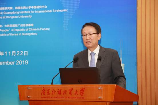 2019年11月22日,由广东国际战略研究院、21世纪海上丝绸之路协同创新中心与韩国东西大学东亚研究院联合举办的第一届21世纪海上丝绸之路-新南方政策合作论坛在我校举行。广东外语外贸大学党委书记、广东国际战略研究院常务副院长隋广军,韩国原驻华大使、东西大学东亚研究院院长辛正承,韩国驻广州总领事馆裴汉镇副总领事等专家学者参加论坛。论坛由王廷惠副校长主持。此次论坛得到了中国驻釜山总领事馆和韩国驻广州总领事馆的大力支持。