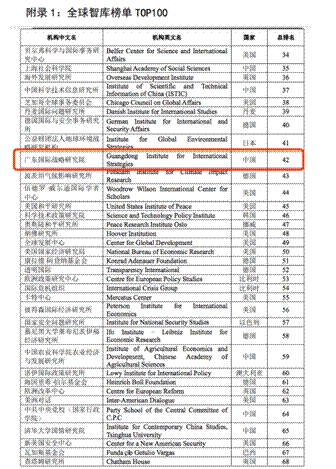 近日,浙江大学信息资源分析与应用研究中心发布了《全球智库影响力评价报告2020》(以下简称《智库报告》),广东省共有2家智库入选,其中广东国际战略研究院在全球智库榜单TOP100中排名42,在中国智库榜单TOP100中排名14。在全球智库影响力9个分领域榜单中,4个榜单进入TOP20: 全球政府治理领域智库TOP20排名5,全球综合类智库TOP20排名13,全球国家安全领域智库TOP20与社会政策领域TOP20均排名17。