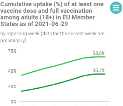 ECDC的数据显示,截至29日,在欧盟境内有58.8%的民众接种了至少一剂疫苗,有36.2%的民众接种了两剂疫苗。ECDC执行主任阿蒙(Andrea Ammon)博士认为,如想防止疫情复燃,最有可能采取的办法即是缩短第二剂疫苗与第一剂疫苗接种的间隔时间。