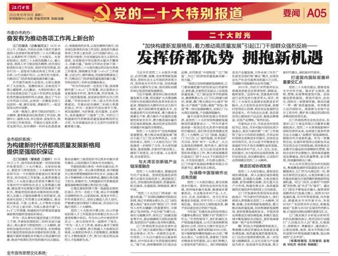 党的二十大报告中“加快构建新发展格局,着力推动高质量发展”部分引起了江门社会各界热议。大家纷纷表示,党的二十大报告为江门的发展进一步指明了方向,令大家倍感振奋,备受鼓舞,在新时代新征程上,感到干劲更足、动力更强、斗志更昂扬、信念更坚定。