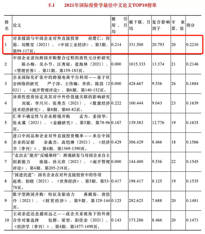 2022年12月2-4日,2022年中国世界经济学会年会暨中国世界经济学会中青年论坛在四川成都召开。《世界经济年鉴》编辑部在大会上发布了2021年世界经济学最佳论文TOP10榜单,包括世界经济学及其八个子学科最佳中文论文TOP10榜单和最佳英文论文TOP10榜单。论文均基于被引用数、所获专家投票数、下载数和发刊影响因子综合评定,相应权数分别为0.6、0.2、0.1和0.1。