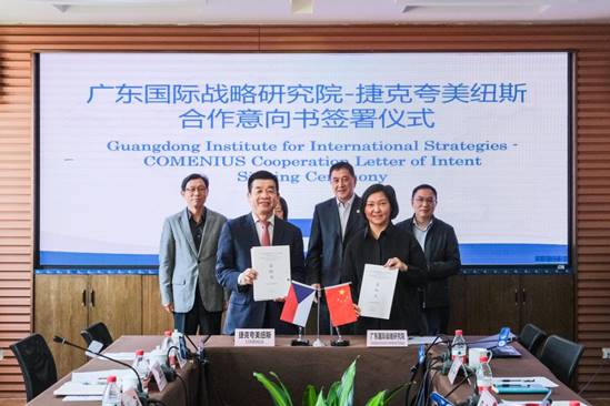 3月7日,广东国际战略研究院与捷克夸美纽斯(Society of Comenius)签署合作协议。中国侨联副主席、广东公共外交协会副会长黎静、广州市侨联主席卞勇、中捷经贸文化交流协会会长李以森、我院院长隋广军教授、广外副校长刘海春教授和我院执行院长李青教授等参加签约仪式。仪式由我校科研部部长陈平主持。