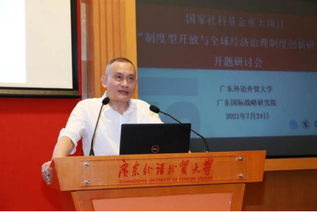 2021年7月24日下午,国家社会科学基金重大项目“制度型开放与全球经济治理制度创新研究”开题论证会在广东外语外贸大学举行。来自全国各地高校和科研单位的专家、学者齐聚一堂,对重大项目研究工作及研究方案展开深入讨论。