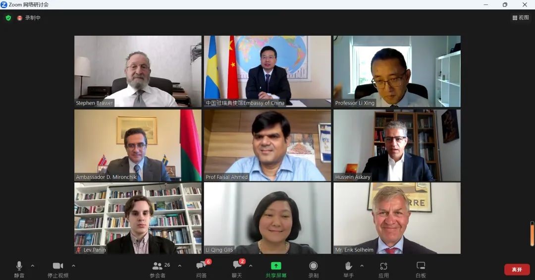 2023年6月28日下午,我院执行院长李青教授受邀参加“脱钩还是架桥:对全球文明倡议的呼吁”网络研讨会,并发表题为《中欧文明互鉴》的主题演讲。研讨会由瑞典“一带一路”研究院(BRIX)主办,中国驻瑞典大使崔爱民、白俄罗斯驻瑞典大使Mironchik以及来自印度和欧洲的专家代表齐聚一堂,就人类文明相处与发展进行深入对话。会议由瑞典“一带一路”研究院主席斯蒂芬·布拉尔(Stephen Brawer)主持。