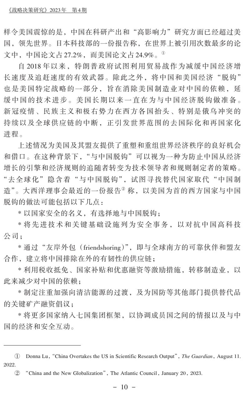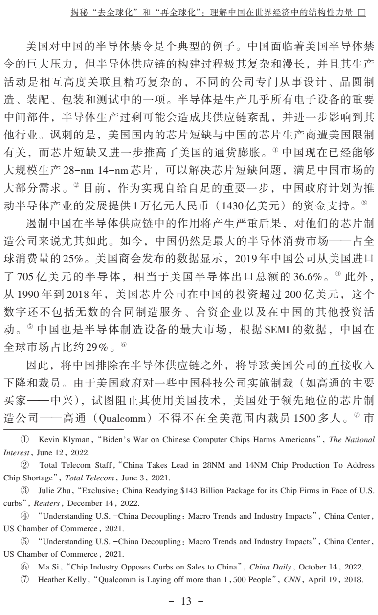 本文认为,可以将去全球化理解为“对华脱钩”或“对华去风险化”的隐性类比,而再全球化则意味着试图重组或修改中国享有优势地位的现有世界经济模式。再全球化似乎代表着一个由高科技竞争和大国竞争主导的全球化新时代。面对挑战与机遇并存的局面,中国一方面要巩固其当前在世界经济中来之不易的结构性地位,另一方面要积极参与塑造正在形成的新经济秩序。