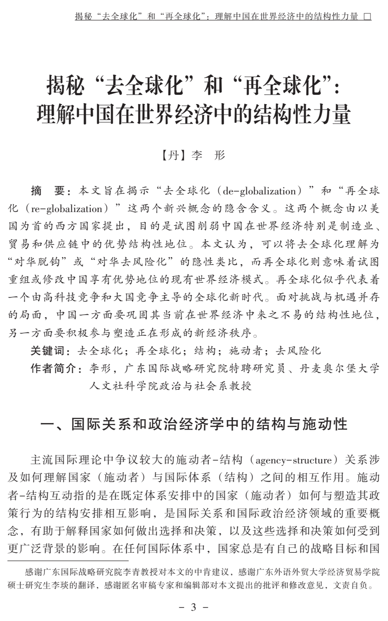 近日,我院特聘研究员李形教授撰写的论文《揭秘“去全球化”和“再全球化”:理解中国在世界经济中的结构性力量》发表于《战略决策研究》(2023年第4期),引起学界关注。