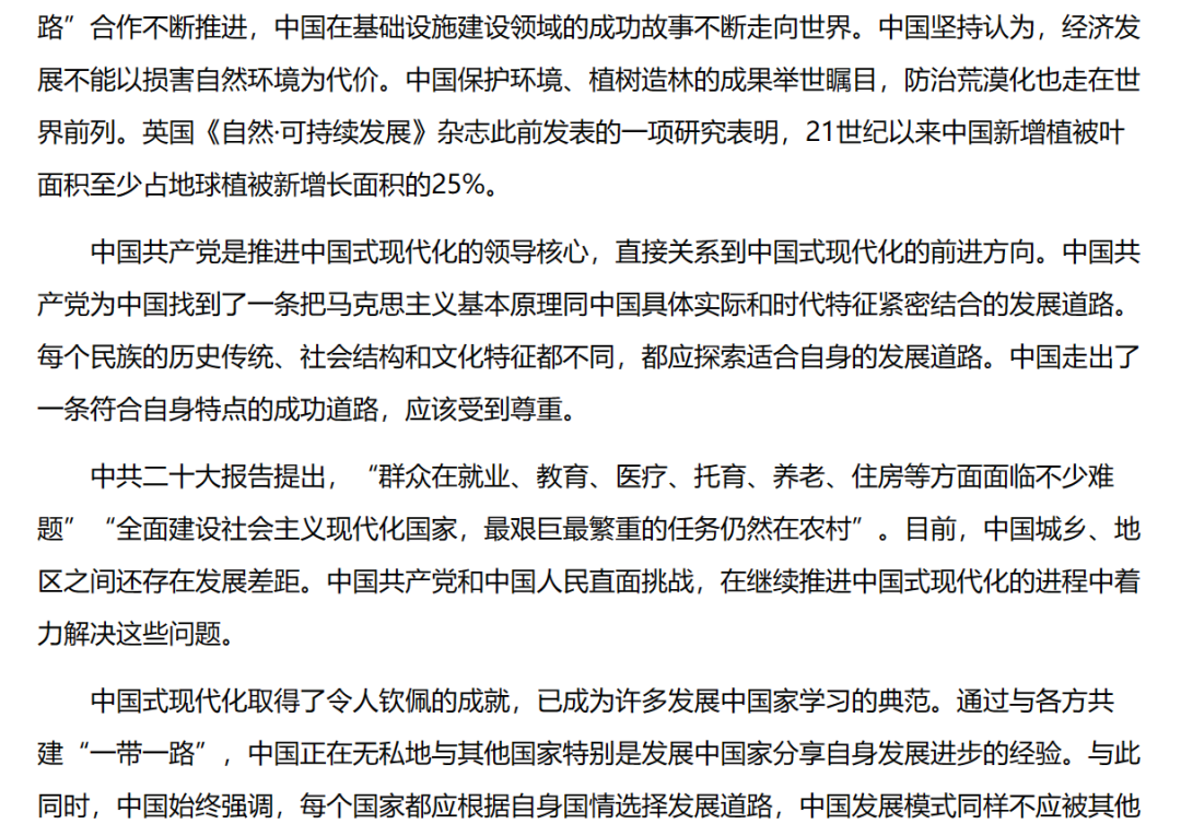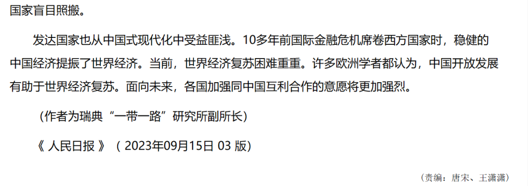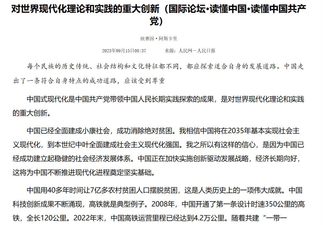 近日,人民日报刊登了我院特聘研究员侯赛因·阿斯卡里(Hussein Askary)先生的文章——《对世界现代化理论和实践的重大创新 | 国际论坛·读懂中国·读懂中国共产党》。侯赛因·阿斯卡里先生在文章中提到到,每个国家都有不同的历史传统、社会结构和文化特征,因此应该探索适合自身的发展道路。他表示中国已经走出了一条符合自身特点的成功现代化道路,这个道路应该受到尊重。他指出中国在现代化道路上的独特性和成功,以及中国共产党的领导在其中的关键作用。中国愿意与其他国家合作,分享发展经验,同时中国始终强调每个国家应根据自身情况选择合适的发展道路,不应被其他国家盲目照搬。