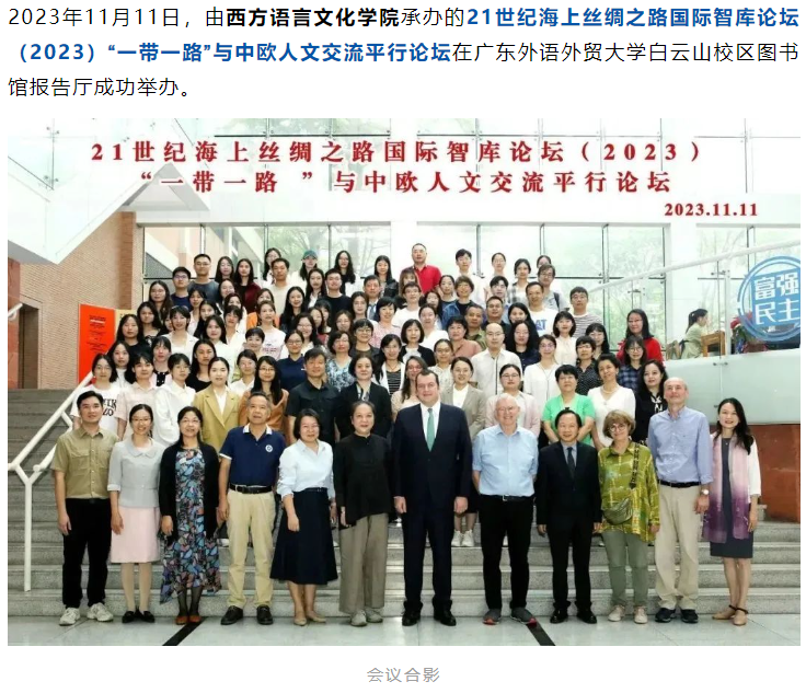 2023年11月11日,由西方语言文化学院承办的21世纪海上丝绸之路国际智库论坛(2023)“一带一路”与中欧人文交流平行论坛在广东外语外贸大学白云山校区图书馆报告厅成功举办。