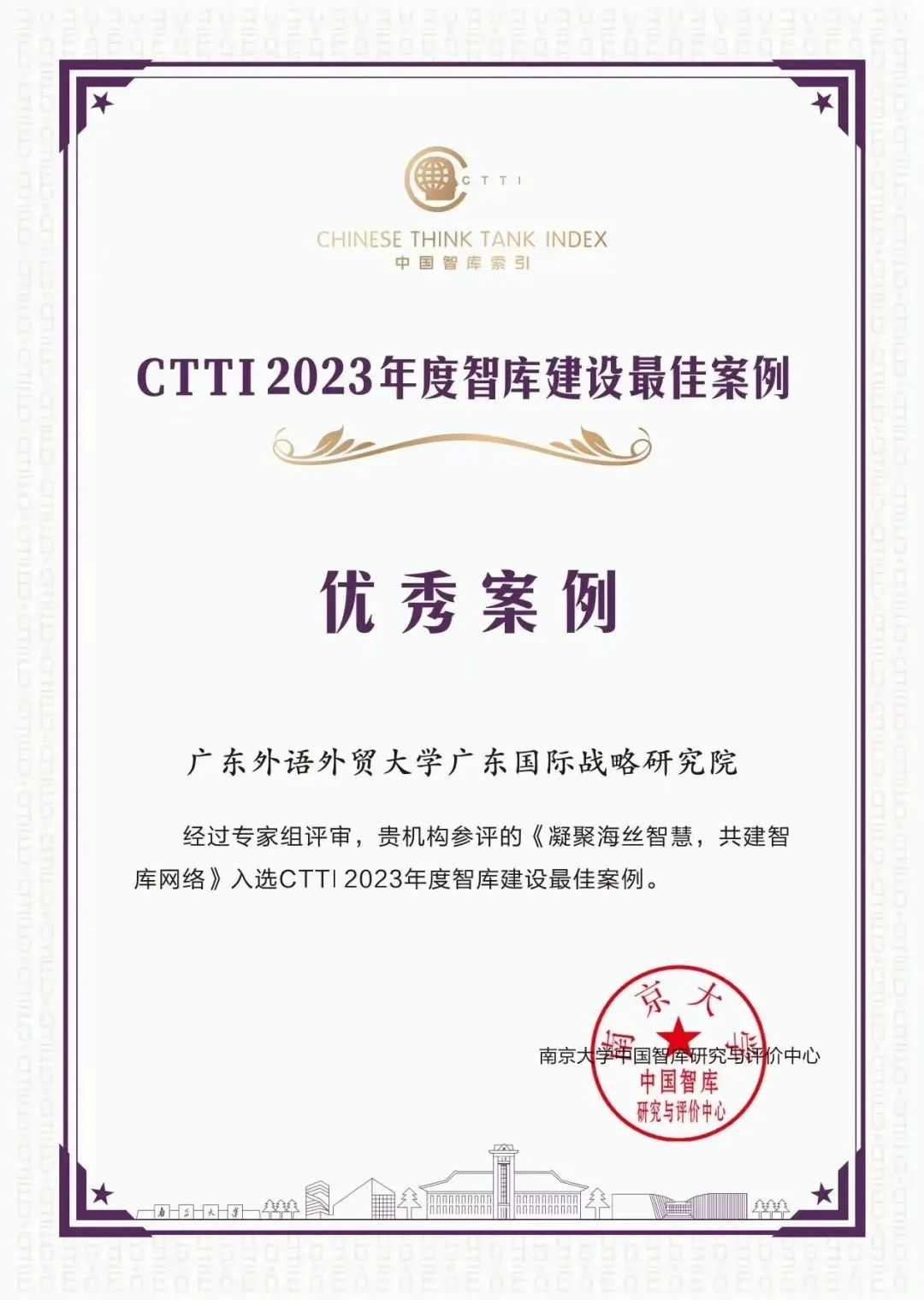2023年,研究院入选中联部金砖国家智库合作中方理事会理事单位和中国企业走出去平台合作智库,智库建设案例《凝聚海丝智慧,共建智库网络》入选CTTI 2023年度智库建设优秀案例,智库影响力进一步提升。