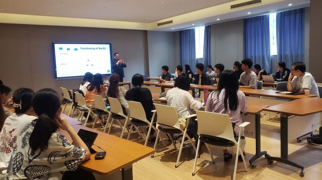 裴伟岷总领事从比利时的视角介绍欧洲一体化的由来、发展历史、主要机构、及里程碑,并提到比利时于2024年1-6月担任欧盟轮值主席的工作。在师生互动环节,我院师生积极围绕比利时和欧盟提问,比利时联邦体制下各地区的关系、比利时对欧盟再东扩的看法,欧洲议会选举的投票率、欧盟的战略自主等。