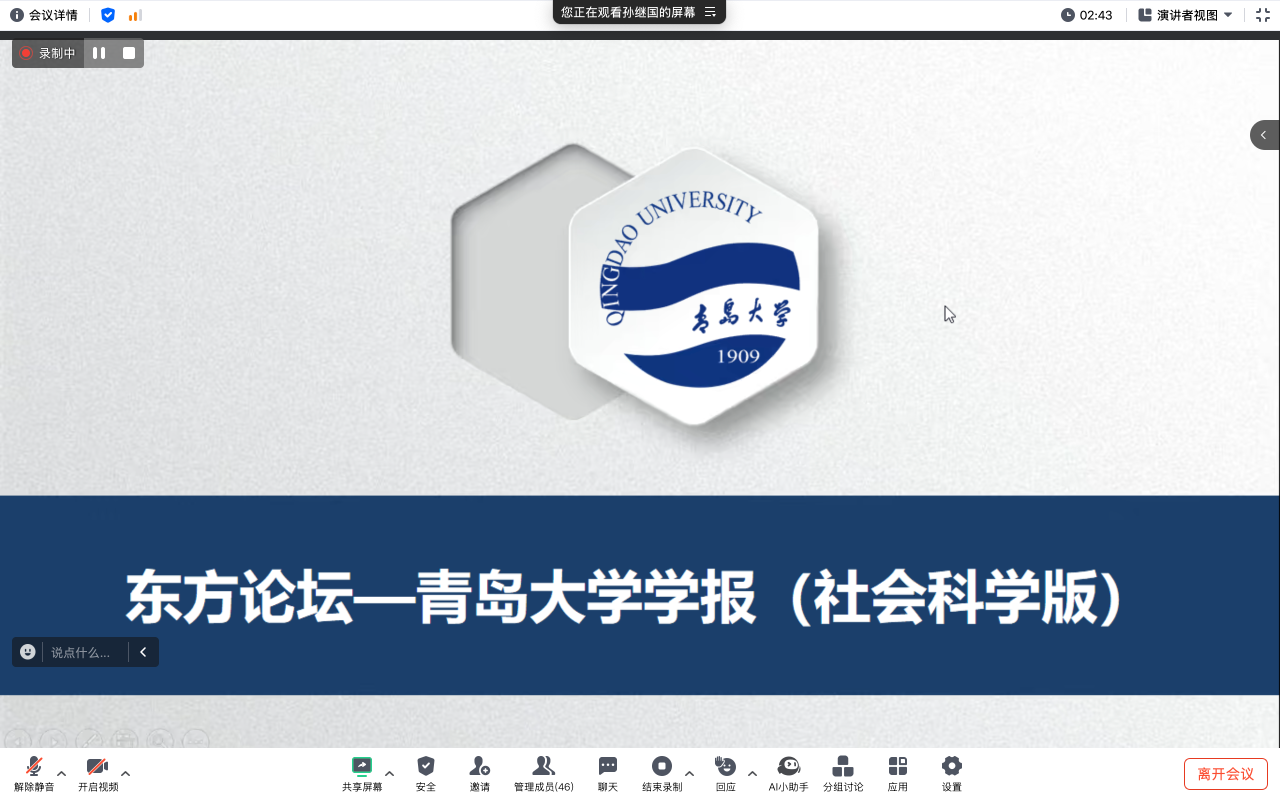 《东方论坛—青岛大学学报(社会科学版)》编辑部孙继国老师简要介绍了期刊的基本情况并向同学生分享了论文写作的几点感悟。他在讲座上表示,写作能力、文字素养能力、综合组织能力是广大青年学子在论文写作过程中需要着重培养的地方。