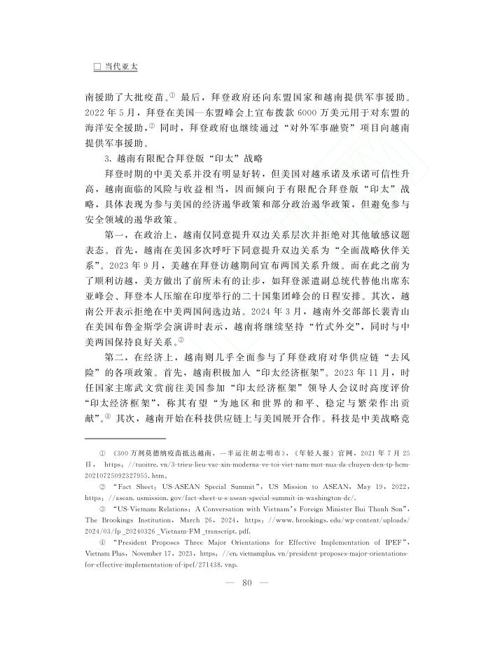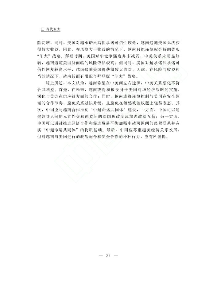 文章分析了越南对美国不同时期对华战略的不同回应。越南在奥巴马的"亚太再平衡"战略中表现出积极态度,因为风险小、收益大;对特朗普的"印太"战略持谨慎态度,因风险大、收益有限;而对拜登版的"印太"战略则有一定热情,因为虽然风险依旧,但收益有所上升。越南的回应主要取决于美国战略的竞争强度和对越承诺的可信性。文章认为,越南将采取审慎的外交政策,中国应推进 “中越命运共同体”建设,同时对越美合作保持警惕。