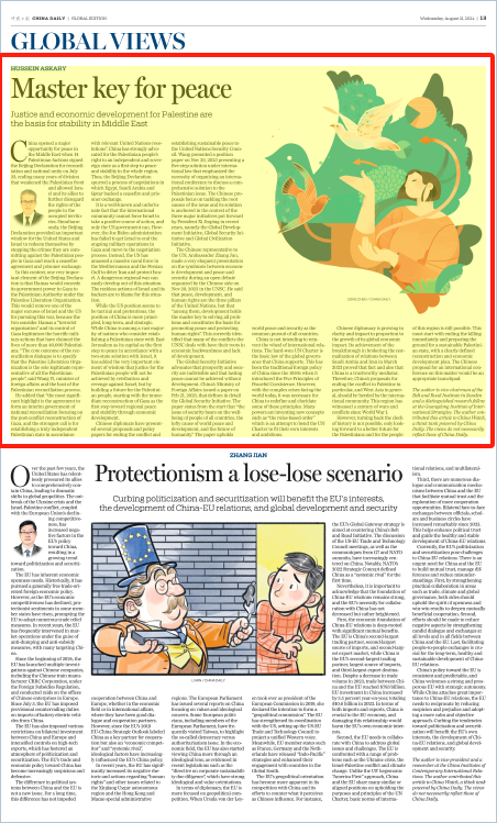 美国国务卿布林肯日前第9次访问中东,但仍未能推动加沙停火。与美国“拉偏架”的做法不同,中国基于和平共处五项原则,提出了更具原则性、长期性和战略性的立场。近期巴勒斯坦各派别签署《关于结束分裂加强巴勒斯坦民族团结的北京宣言》,为结束内部分裂、促进中东和平创造了机遇。我院特聘研究员、瑞典“一带一路”研究所副所长侯赛因·阿斯卡里(Hussein Askary)受邀在《中国日报中国观察智库》发表了文章。
