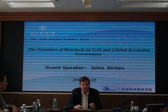 5月12日,由21世纪海上之路协同创新中心主办的海丝国际智库论坛系列活动云山学术沙龙第114期在广东国际战略研究院举行。加拿大多伦多大学John Kirton教授作为主讲嘉宾,发表了题为"G20和全球经济治理的前沿研究"的学术演讲。沙龙由21世纪海上丝绸之路协同创新中心理事会秘书长、广东国际战略研究院秘书长李青教授主持。